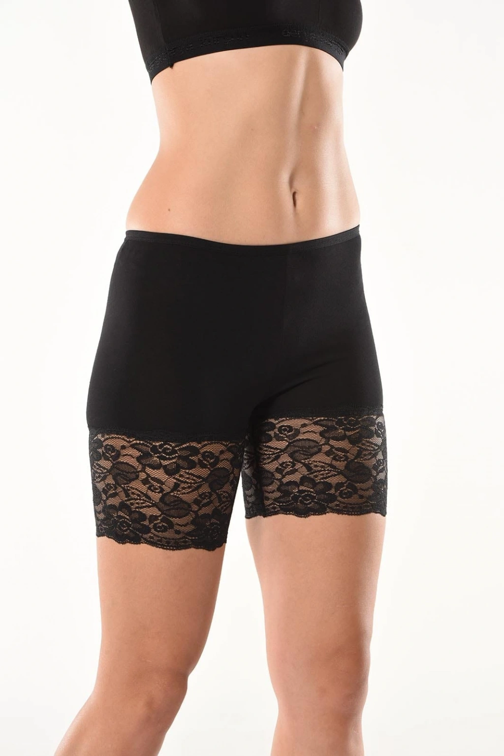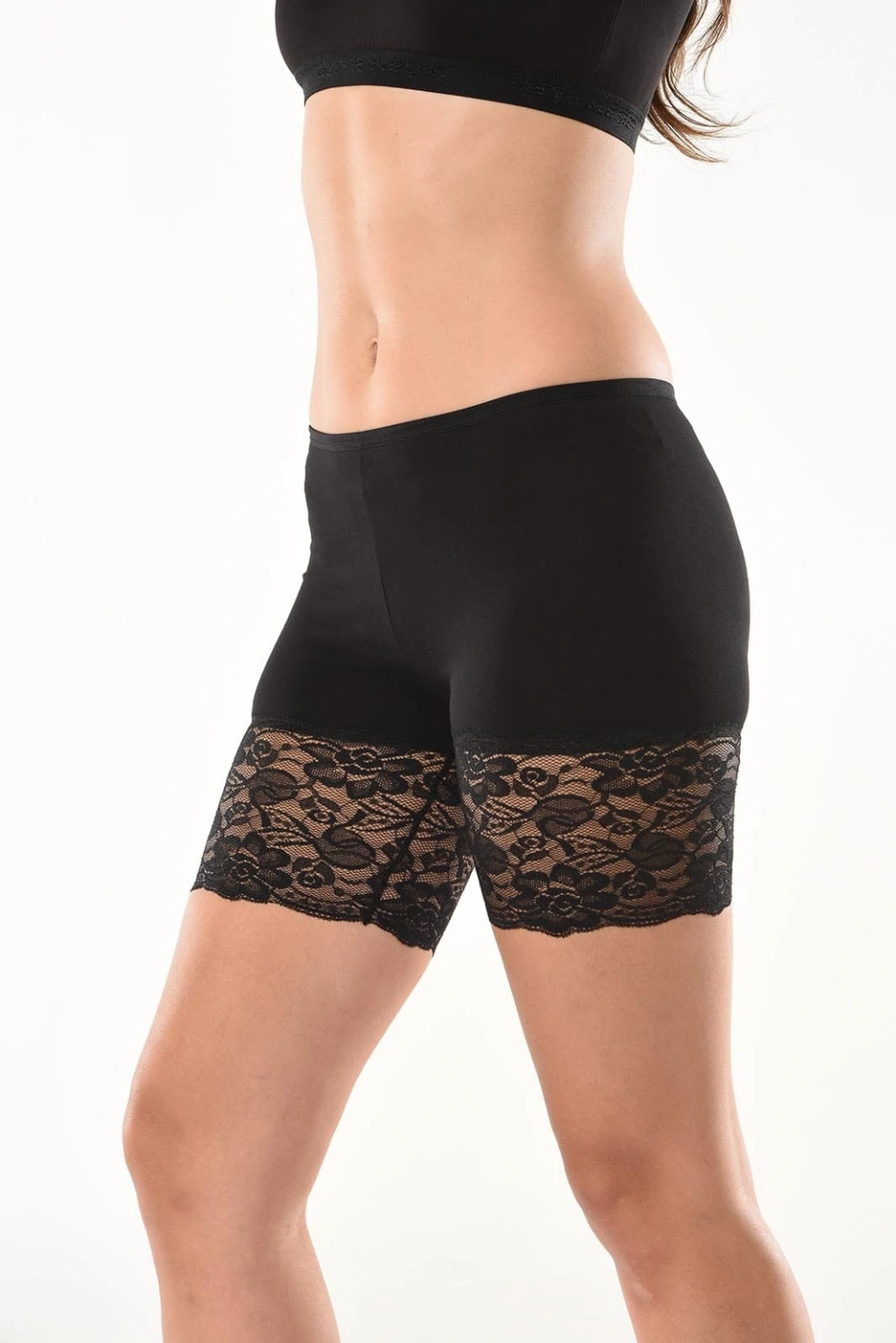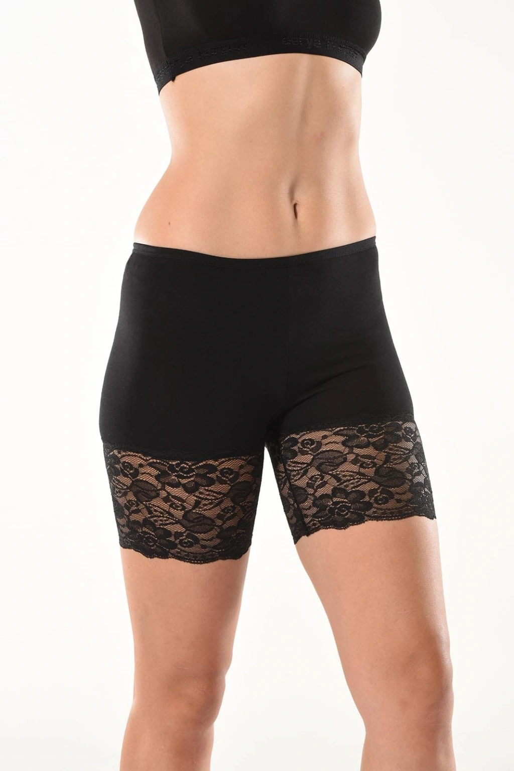 Paça kısımlarından dantelli, basen kısımlarından vücudu tam saran yeni sezon kısa şort tayt modelidir.