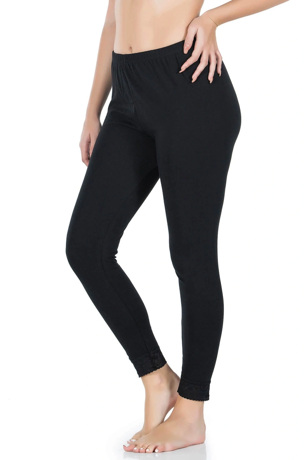 Paça kısımlarından dantelli, belden lastikli uzun kadın tayt modelidir.