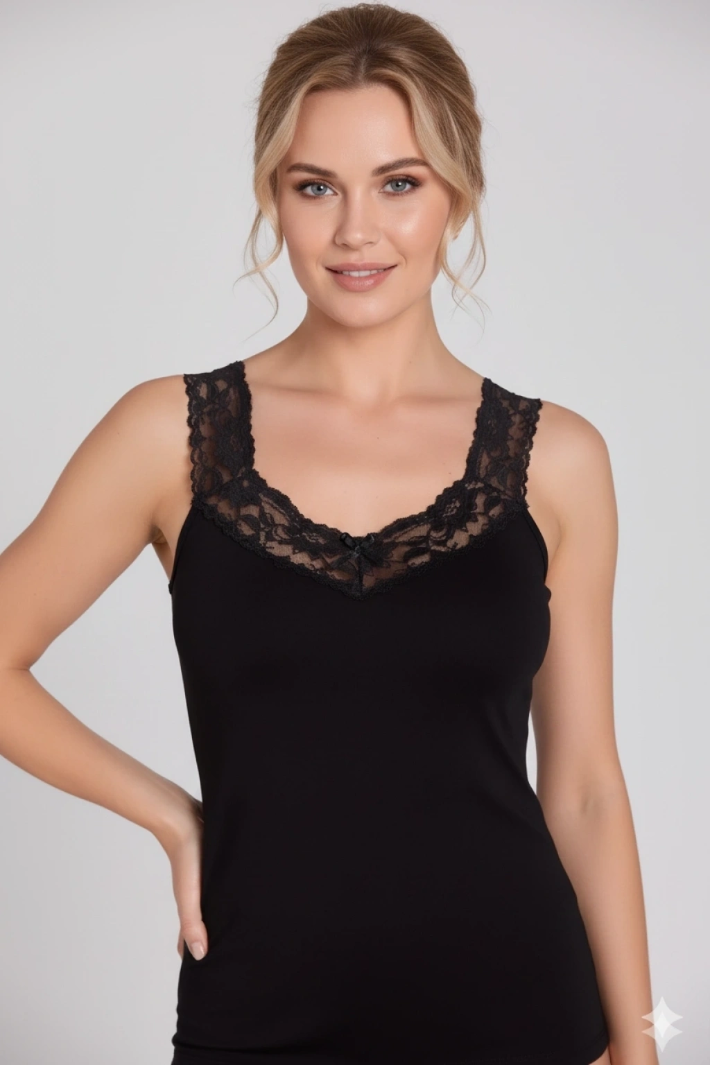 Şahinler'in şıklığı ve rahatlığı bir araya getirdiği Yaka ve Askıları Dantelli Ribana Atlet B605, iç giyimde şıklık arayan kadınların tercihi oluyor.