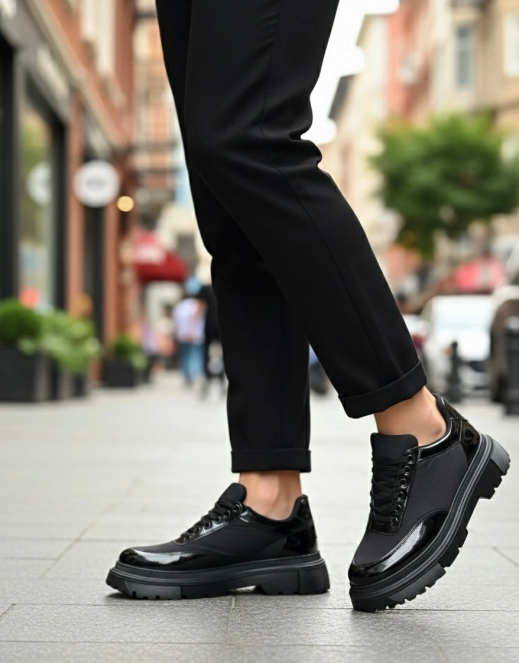 BA0243 Bağcıklı Rugan Paraşüt Detaylı Yüksek Siyah Taban Erkek Ayakkabı