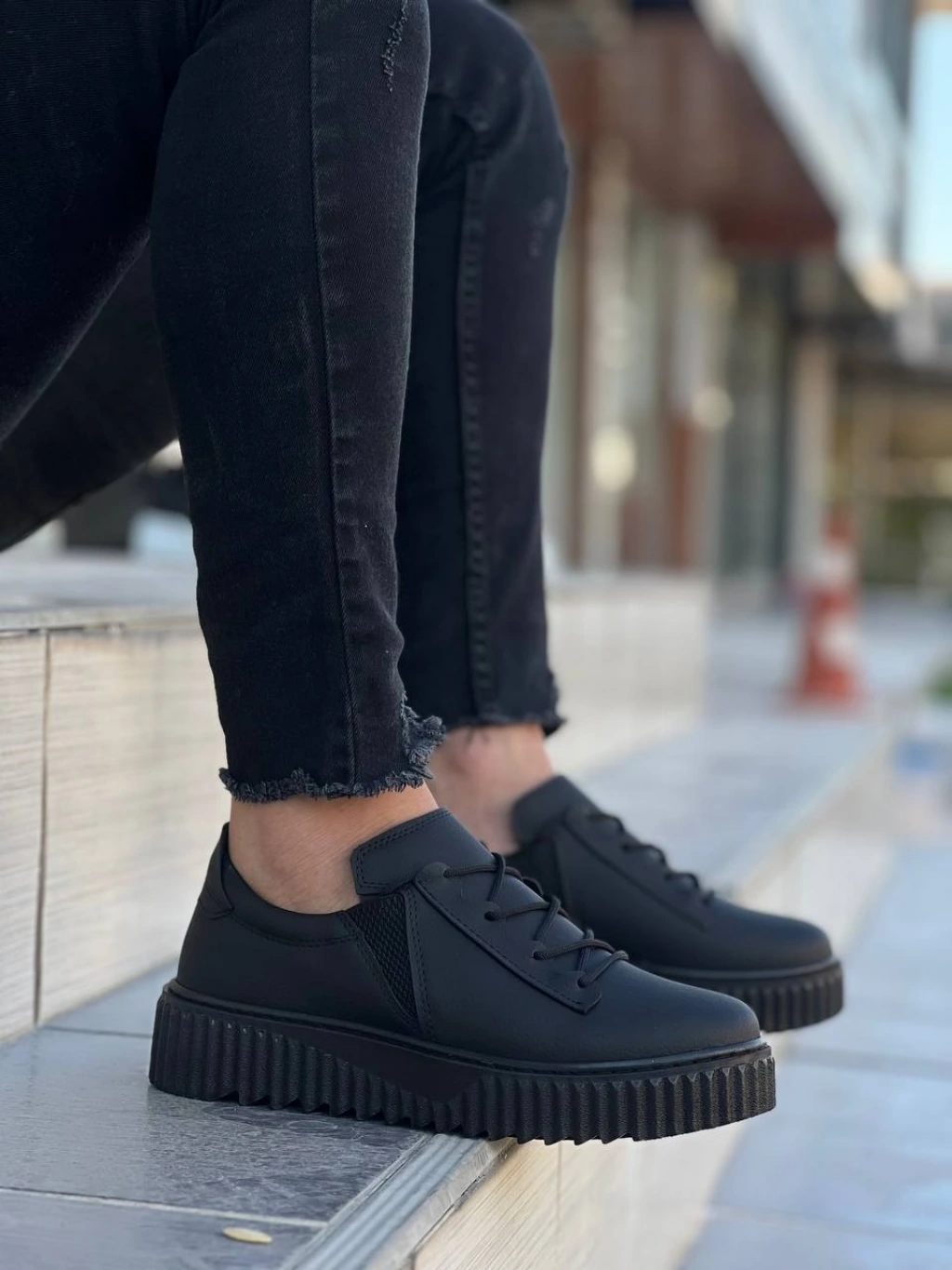 KB-X502 Kuback Siyah Cilt Yüksek Siyah Taban Bağcık Detaylı Lastikli Günlük Erkek Ayakkabı