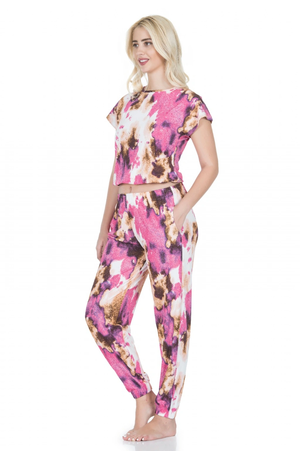 Yeni sezon paça kısımlarından lastikli, üst kısımdan yarım kollu çok şık kadın tayt takım modelidir.Desenli üst ve desenli tayt olmak üzere 2 parçadan oluşmaktadır.