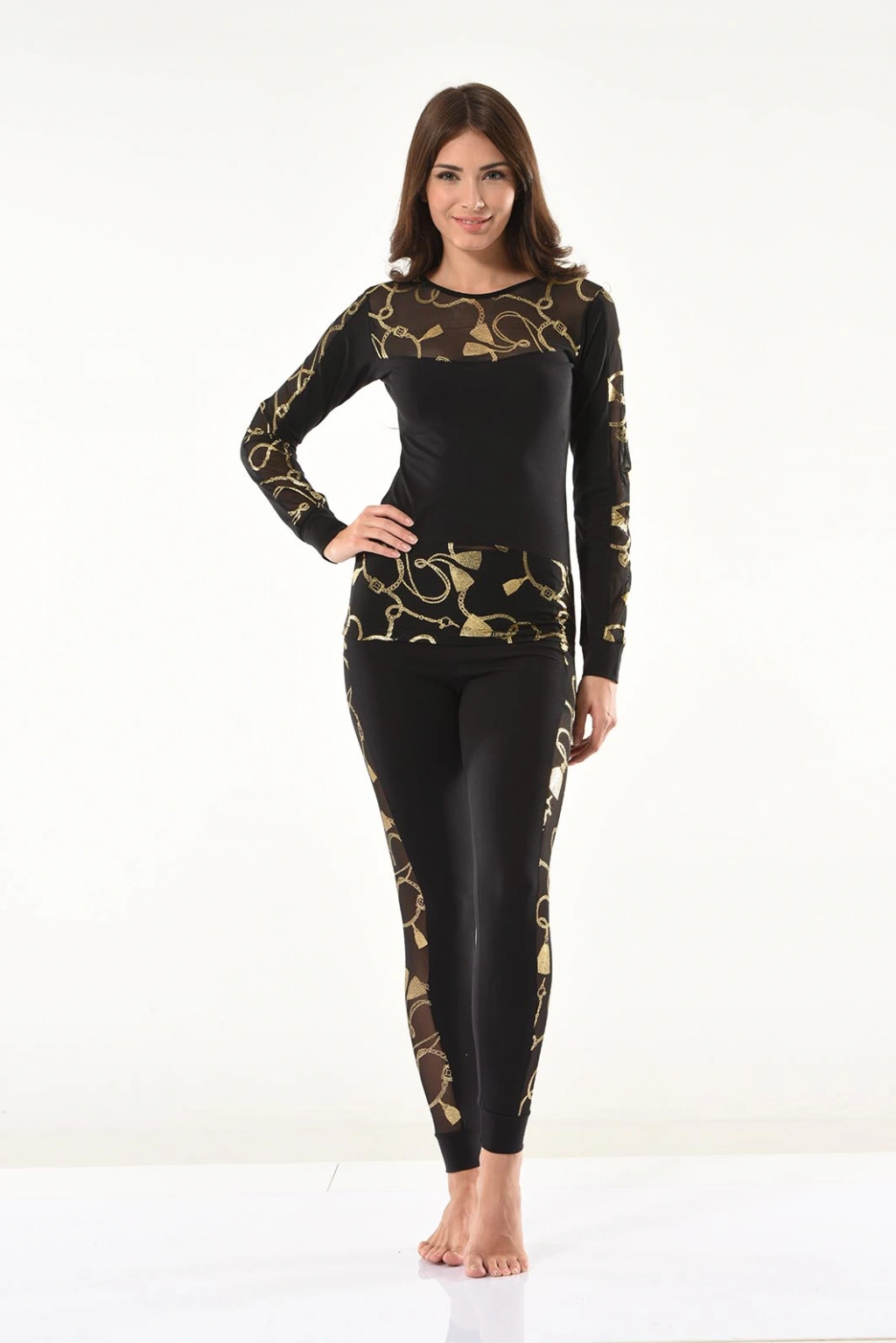 Parlak varak desenli ve transparan detaylarıyla göz kamaştıran yeni sezon uzun kollu kadın tayt takım modelidir.