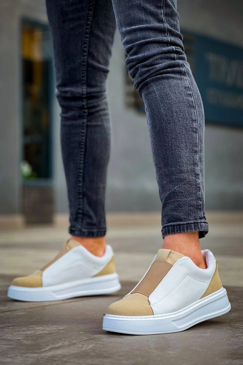 KB-007 Kuback Beyaz Bej Yüksek Taban Tek Bant Bağcıksız Günlük Erkek Ayakkabı