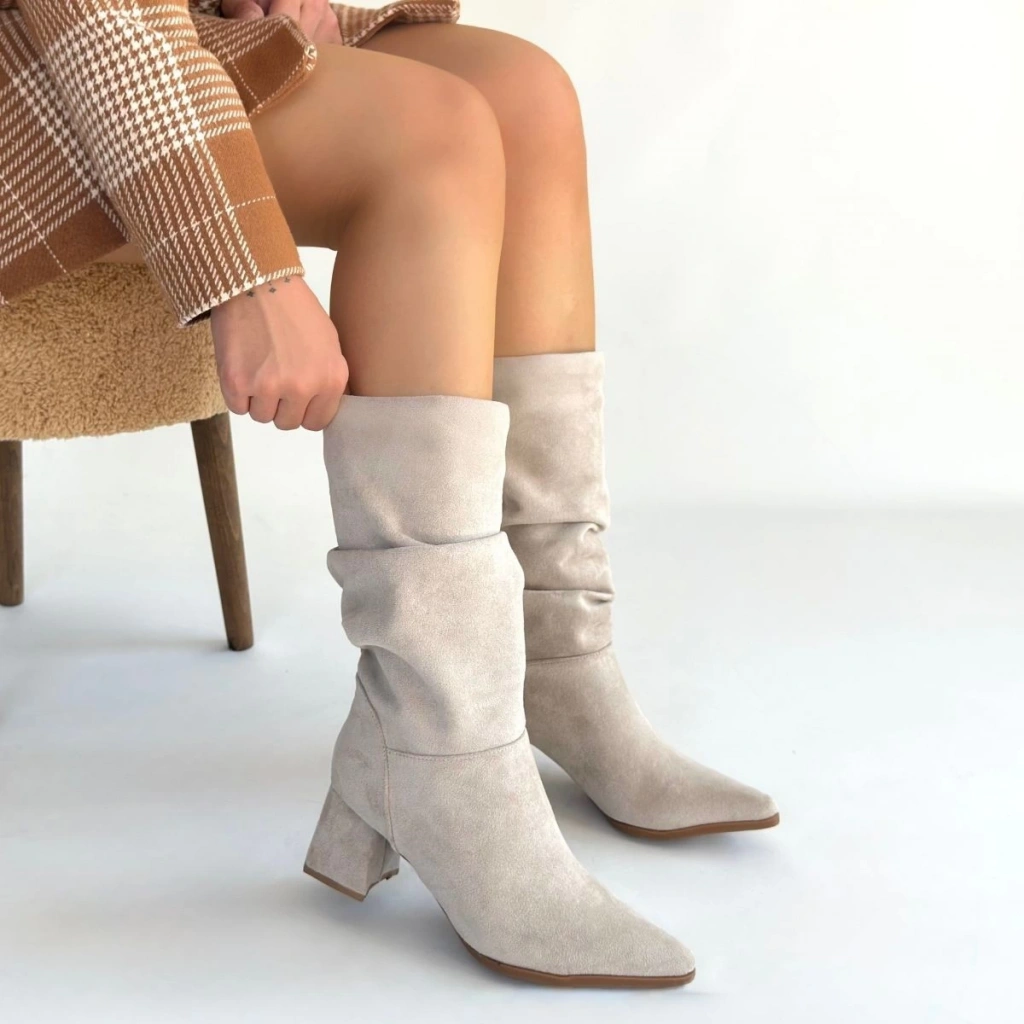 Titen Bej Süet Körüklü Topuklu Çizme