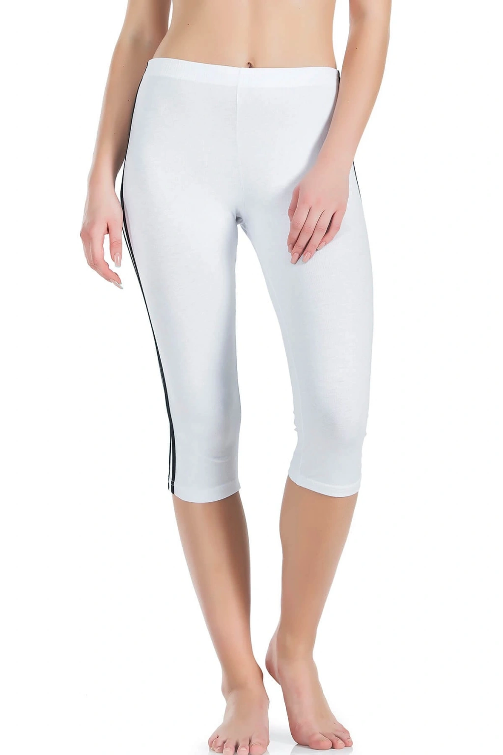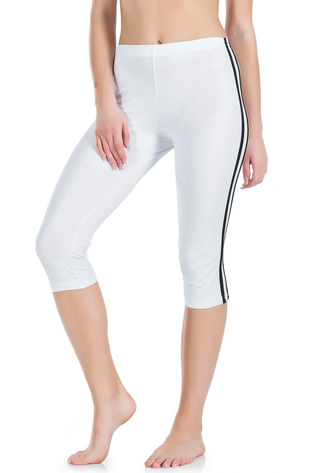 Yanlardan şeritli, vücudu tam saran yeni sezon kısa kapri tayt modelidir.