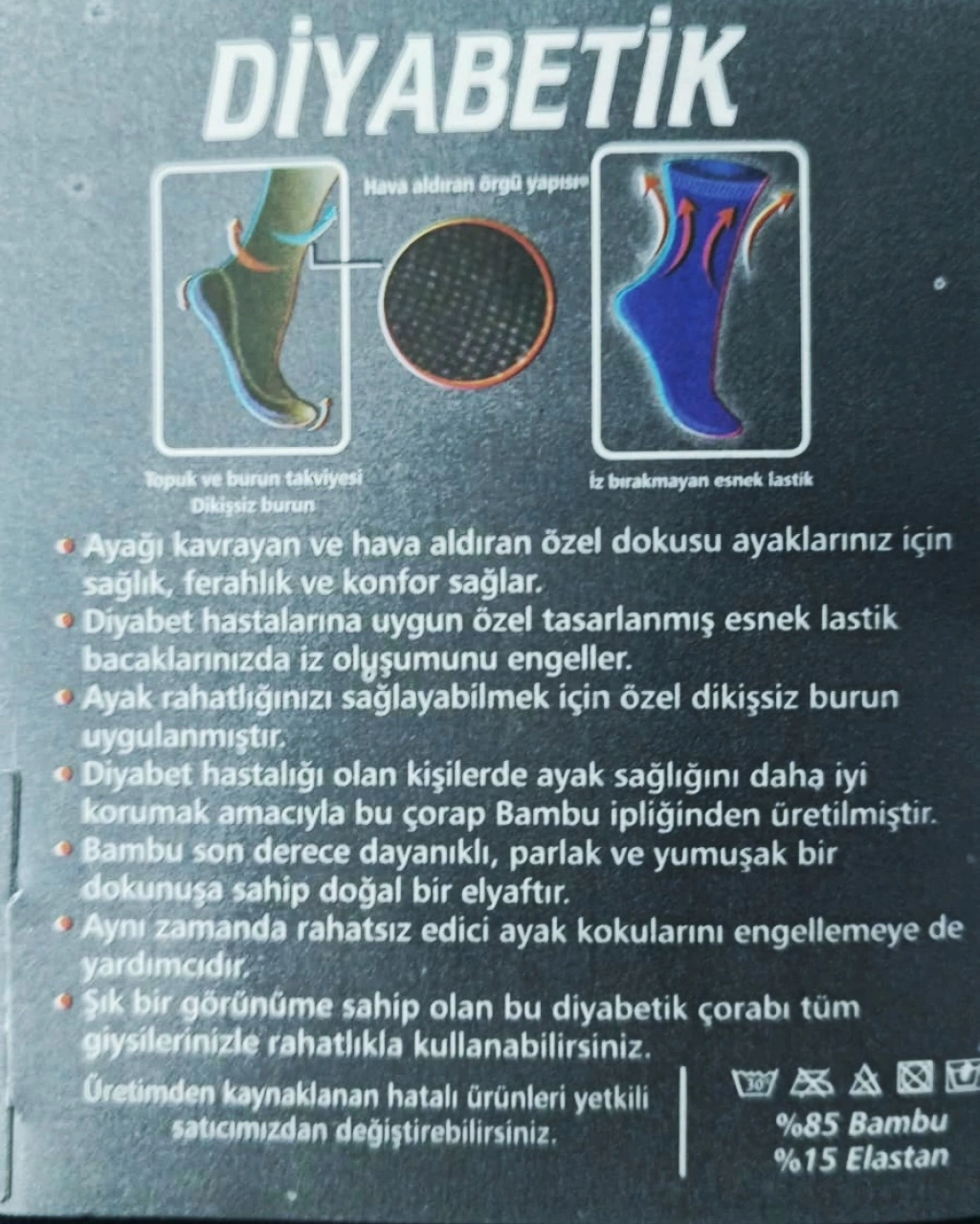 Diyabet hastalığı olan kişilerde ayak sağlığını daha iyi korumak amacıyla bu çorap Bambu ipliğinden üretilmiştir. Bambu son derece dayanıklı, parlak ve yumuşak bir dokunuşa sahip doğal bir elyaftır.