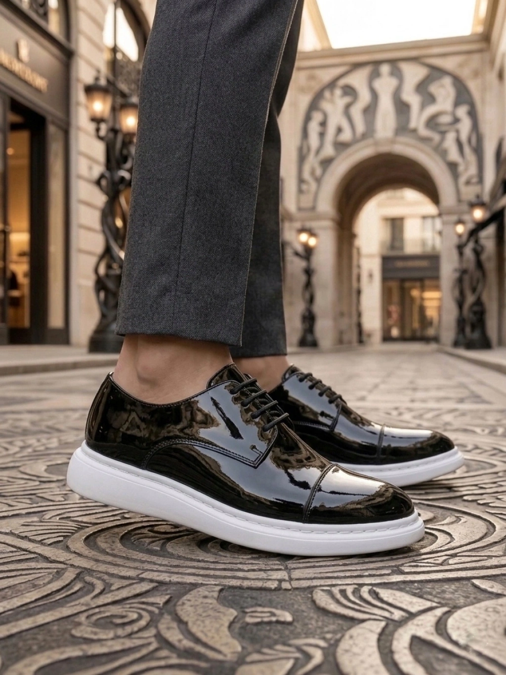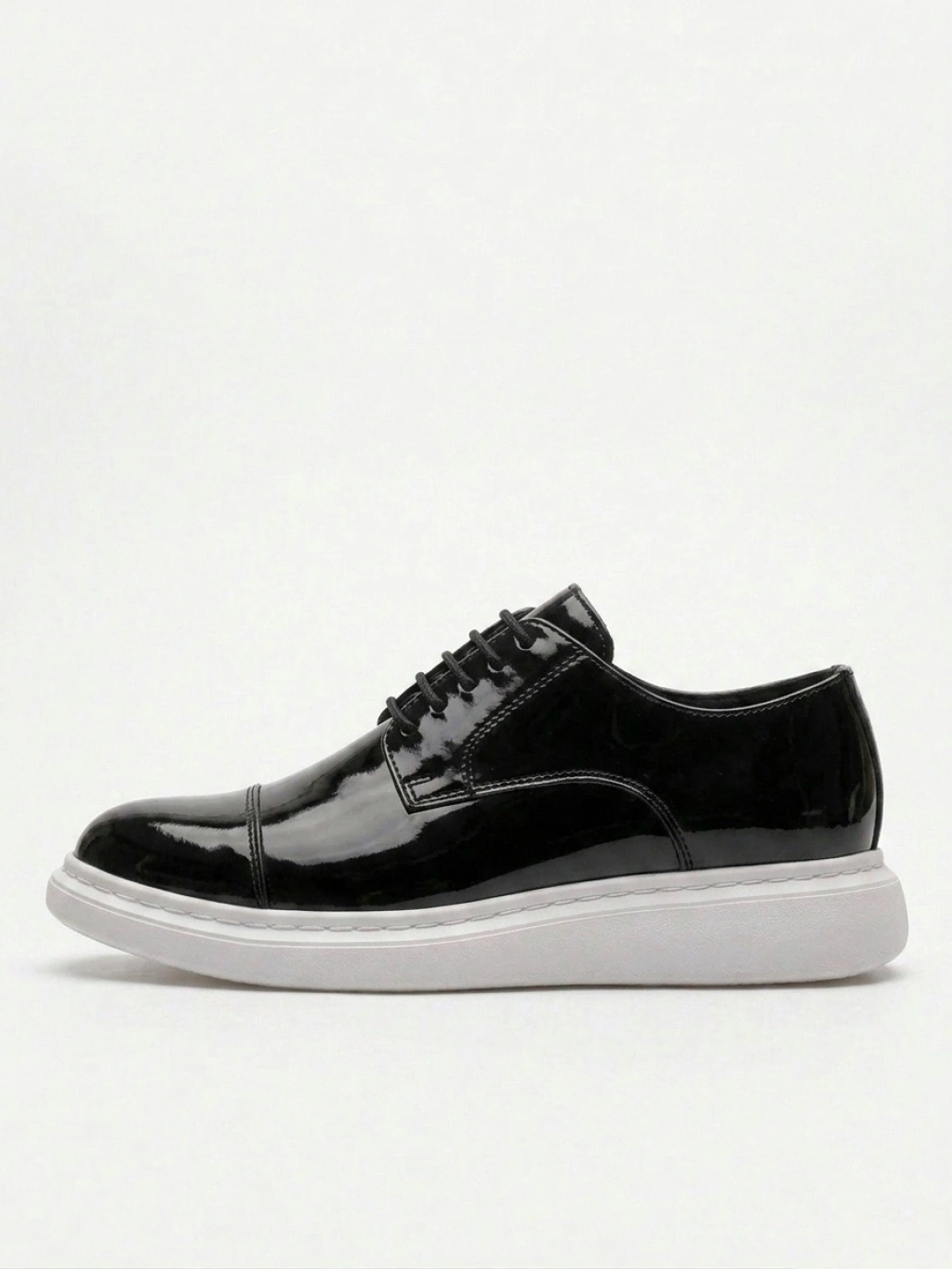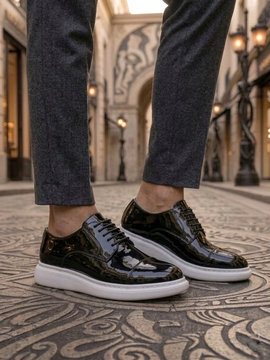 BA0003 Siyah Kapaklı Burun Bağcıklı Rugan Beyaz Taban Erkek Oxford Ayakkabı