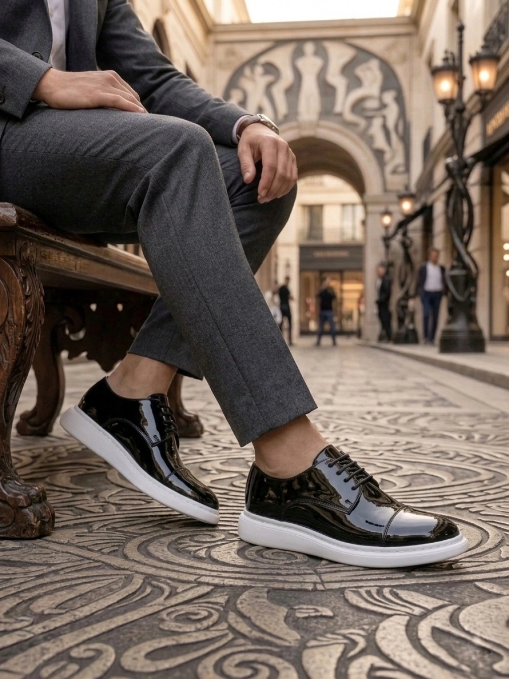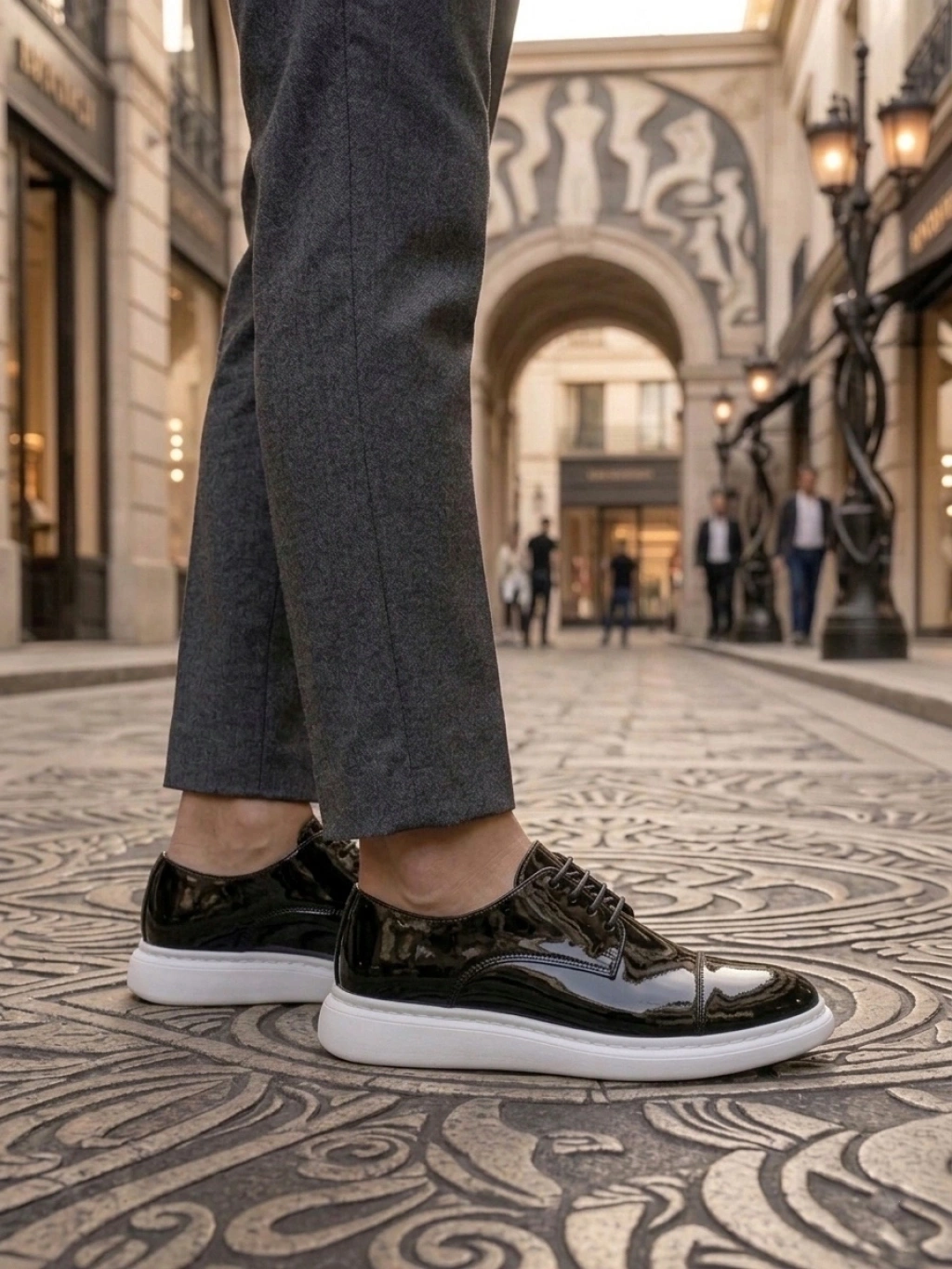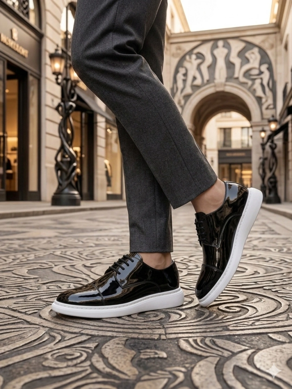 BA0003 Siyah Kapaklı Burun Bağcıklı Rugan Beyaz Taban Erkek Oxford Ayakkabı