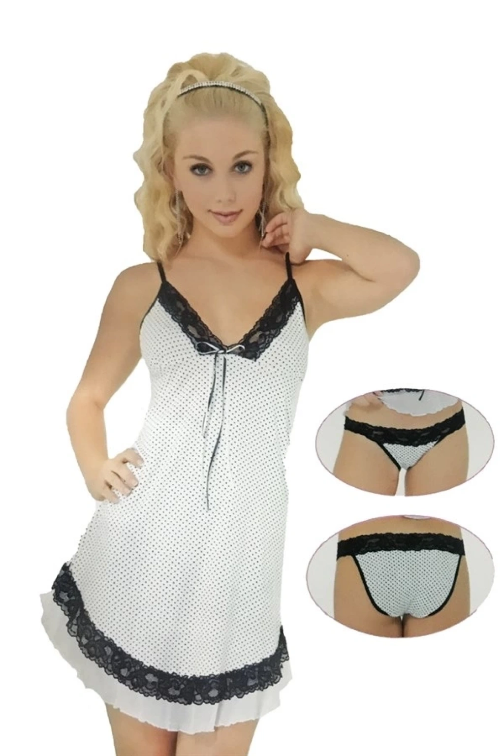 Pınar Beyaz Puantiyeli Gecelik ve KülotTakımı