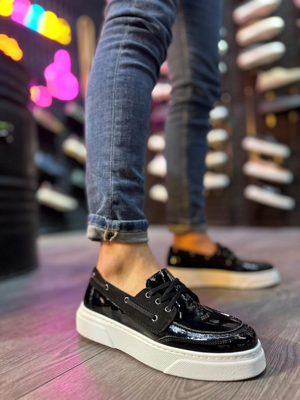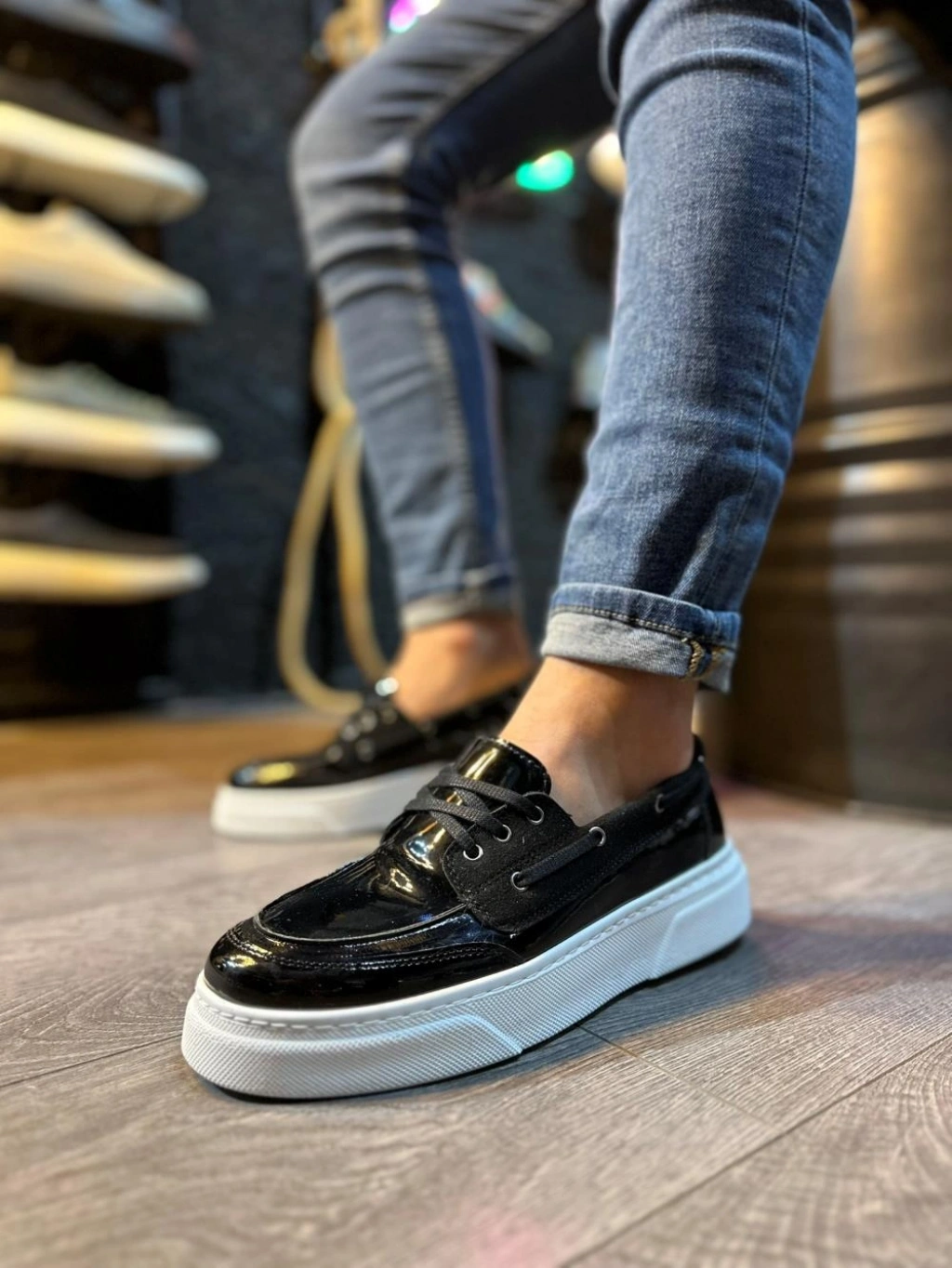 Knack Yüksek Taban Günlük Ayakkabı 700 Siyah Rugan (Beyaz Taban)
