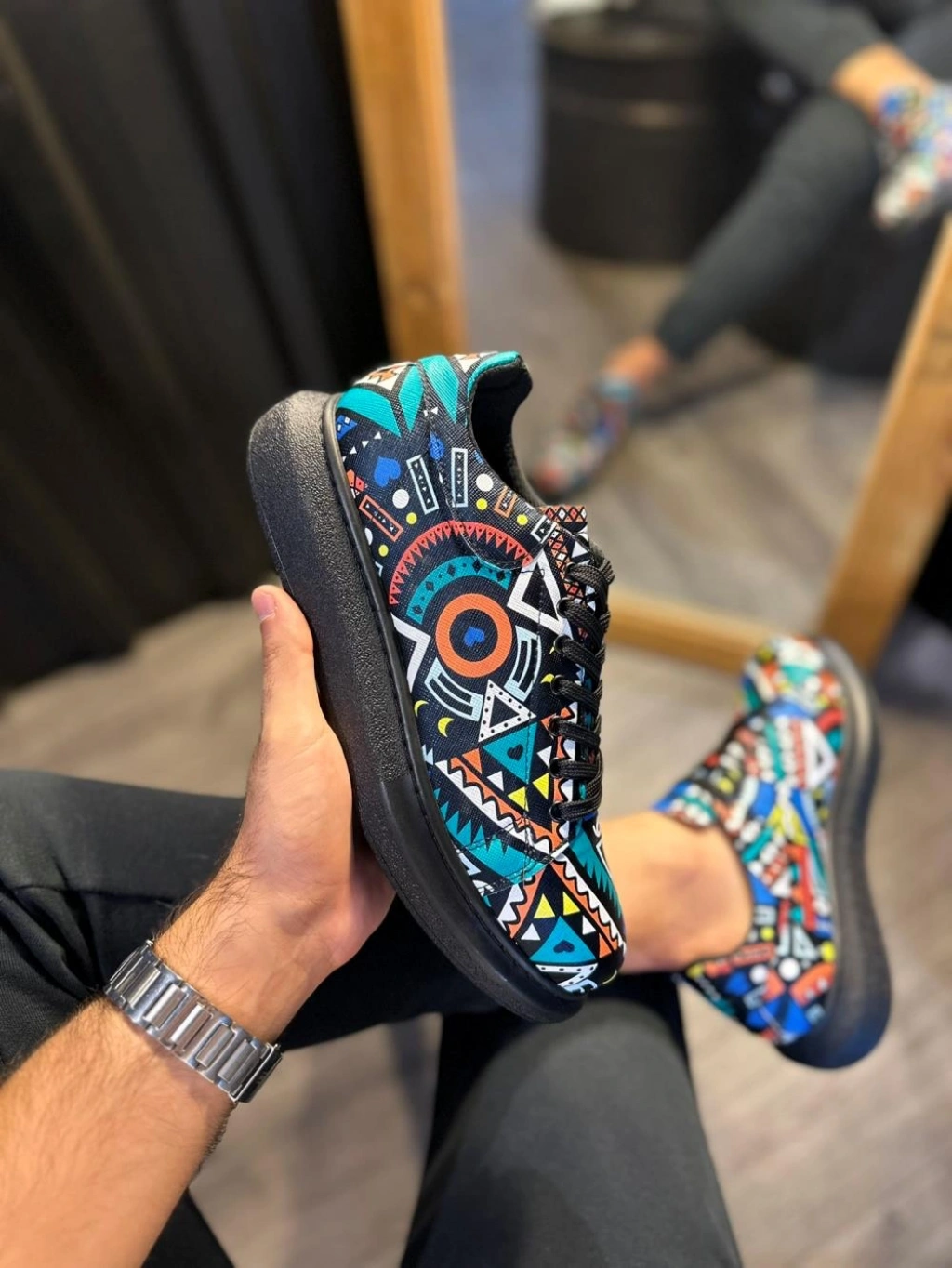 Knack Yüksek Taban Renkli Baskılı Günlük Ayakkabı 046 Siyah (Siyah Taban)